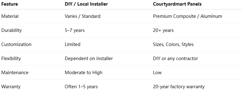 – Local $299 fences often require repainting & repairs. One Courtyardmart panel saves hundreds over time.